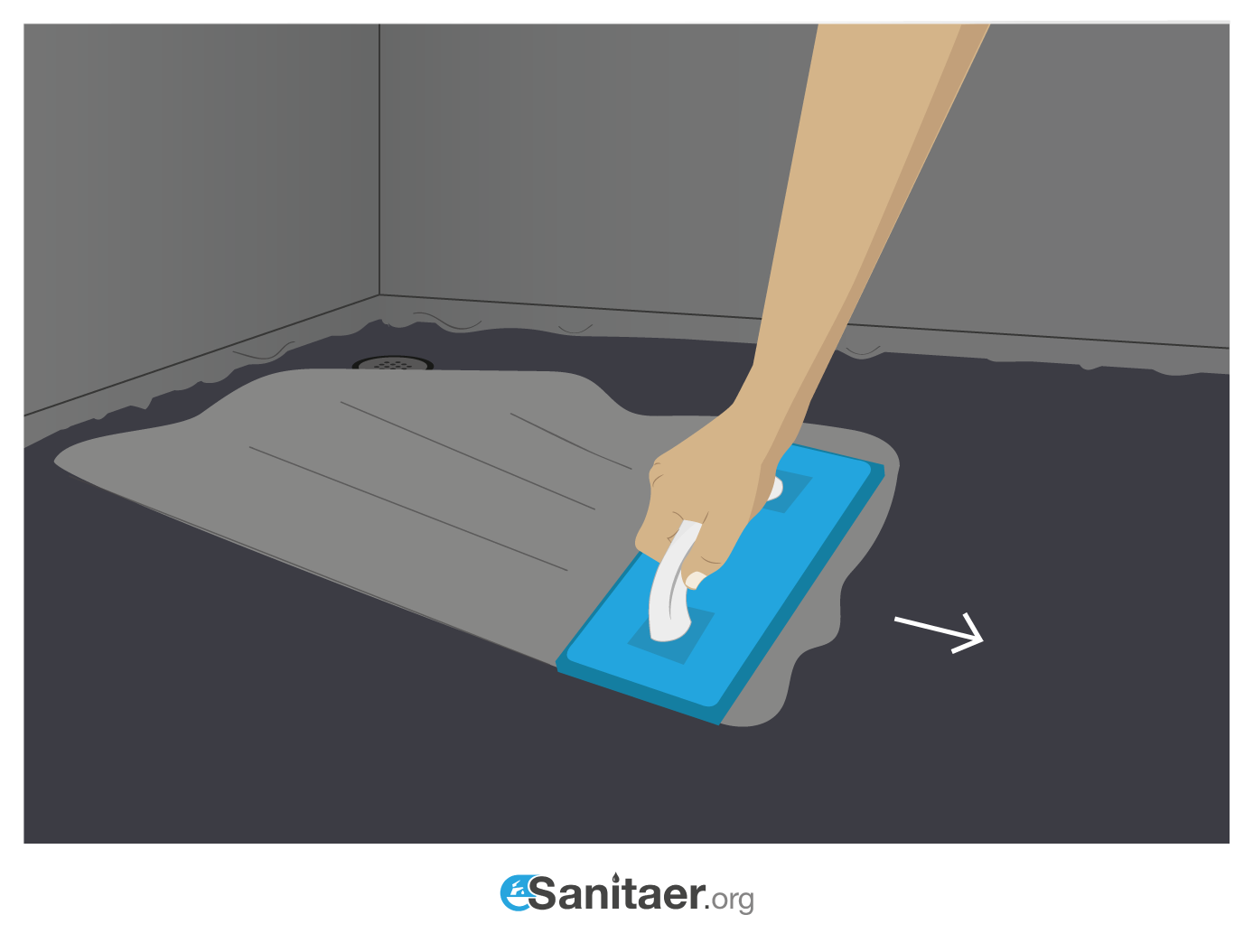 Tragen Sie anschließend die Abdichtungsmasse nun auf die gesamte Wandfläche und Boden auf. Nutzen Sie dafür die Glättekelle.